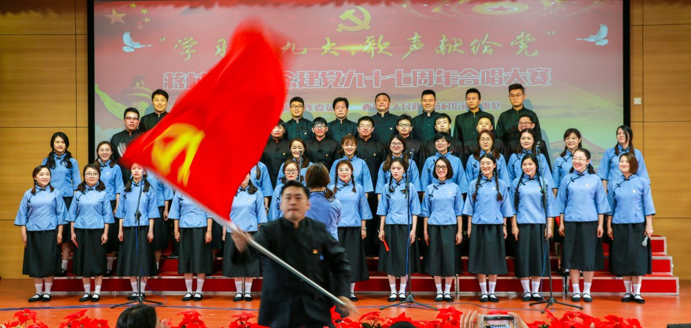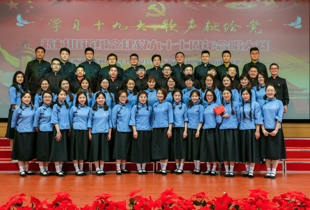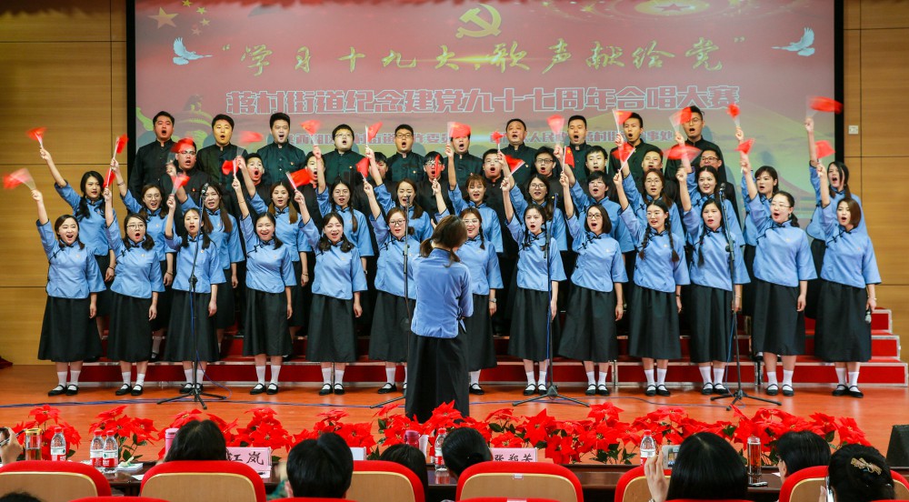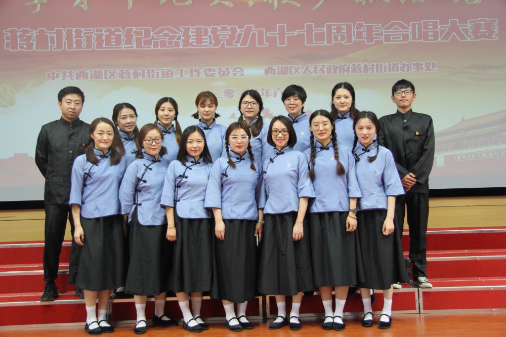 为了隆重纪念中国共产党建党97周年,宣传学习十九大精神,贯彻新思想,放歌新时代,在广大党员群众中传唱革命歌曲,充分展现西湖区蒋村街道人民的良好精神风貌,中共西湖区蒋村街道工作委员会和西湖区人民政府蒋村街道办事处举办了主题为“学习十九大,歌声献给党”的纪念建党九十七周年的合唱比赛。
