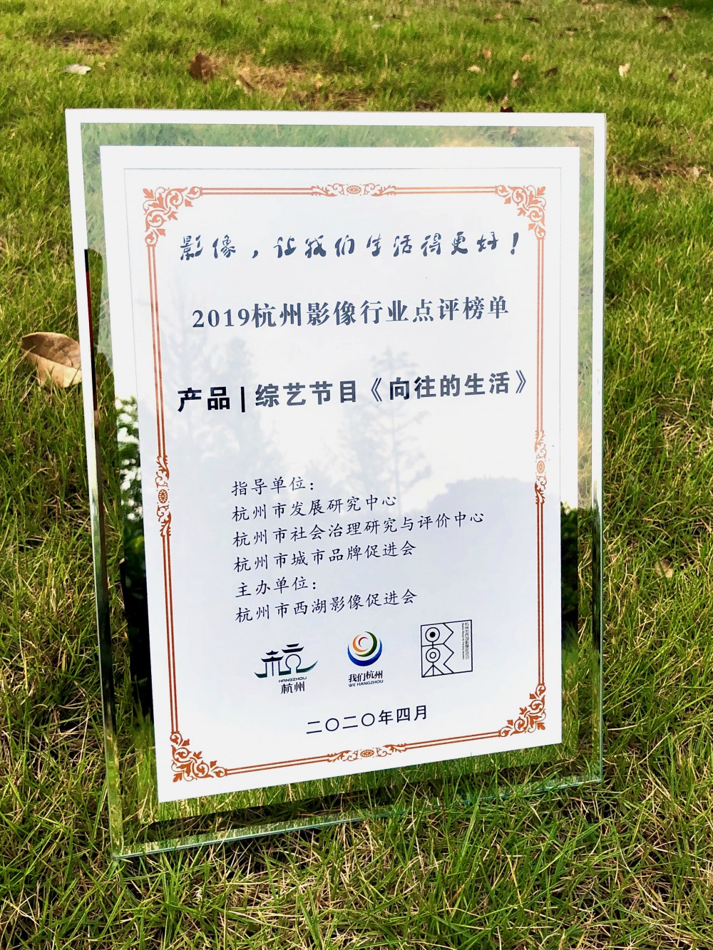 近日,在杭州市发展研究中心、杭州市社会治理研究与评价中心、杭州市城市品牌促进会指导下,杭州市西湖影像促进会主办的2019年度杭州影像行业点评榜单正式发布,此次评选最后产生了2019年度杭州影视现象、人物、产品、区块、活动榜单。《向往的生活》获选2019年度杭州影视产品榜单及2019年度杭州影视现象榜单,也是获选影视产品榜单的唯一综艺节目。