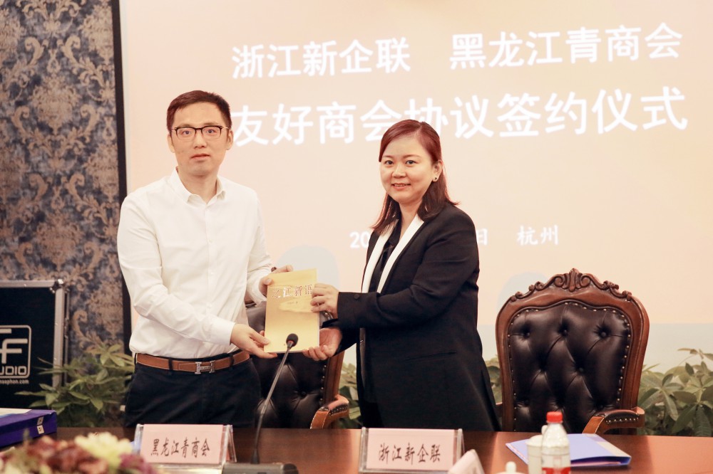 9月14日,黑龙江省青年民营企业家考察团(下称“考察团”)一行来访集团考察并座谈交流,集团总裁章碧珍作为浙江省新生代企业家联谊会副会长兼秘书长参加活动,与对方签署了友好商会协议,并互赠纪念品。